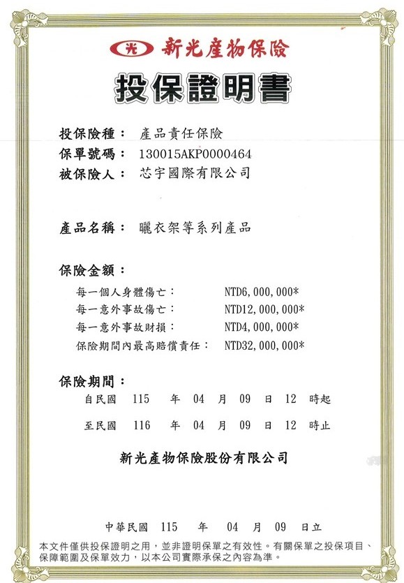 我們從事升降曬衣架的研發、製造、銷售、施工已將近二十年,早期以代工為主,之後於民國九十六年四月成立芯宇國際有限公司,累積多年經驗,將舊有曬衣架再做改良與創新,發展新的專利和商標,推出──輕而易升降曬衣架系列產品。